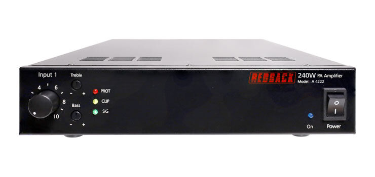 This 240W PA zone amplifier developed by Redback, allows installers to mix and match amplifiers within a 1RU 19” rack space. For instance an installer could mount this 240W amplifier for a high wattage zone, plus a 60W amplifier for a smaller zone - all within a single unit of rack space! This offers flexibility for installers, allowing the installation of zone amps to closely match the requirements of the customer. Each amplifier is a Class-D design offering high performance in a compact space, with excellent power efficiency. The front panel offers adjustment for each channel plus bass and treble control. Individual protection, clipping and signal presence indicators are provided for each channel. All outputs are via pluggable euroblock connectors with 100V line and 8Ω outputs available. Inputs are via stereo RCA line or balanced euroblock pluggable screw terminals. A high pass filter switch can be activated on each channel. For installations using only one amplifier, a mounting bracket adaptor provides an easy way to bolt into a standard 19” racking system.