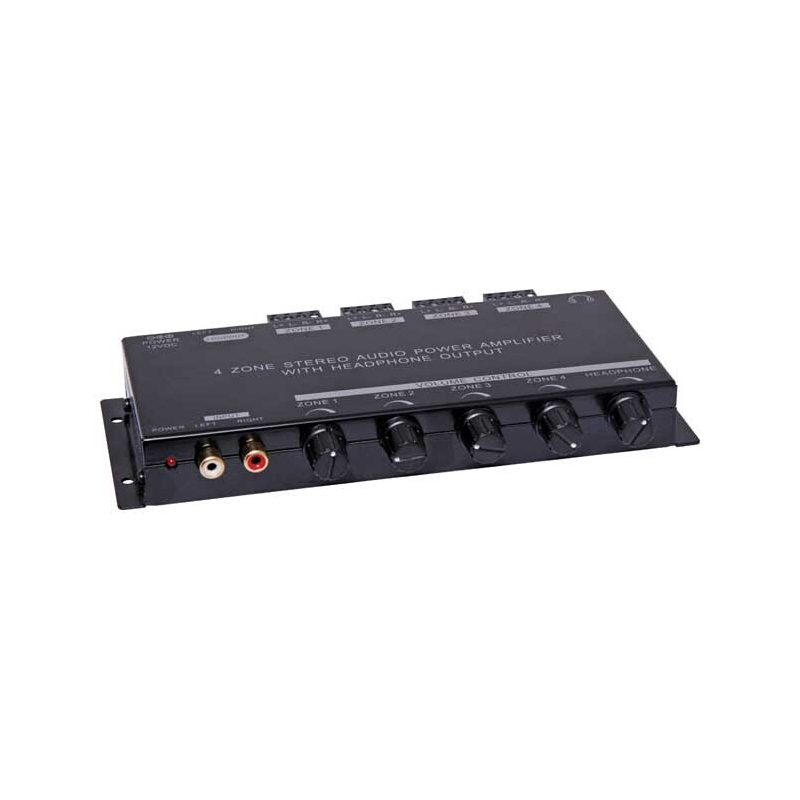 Excellent for multi-room audio distribution, this 12V powered four zone amplifier produces 30W RMS per zone (15W RMS per channel) - all from a case just 200mm across! One input source may be connected on the front panel via stereo RCA sockets. An individual volume control is provided for each zone. Pluggable terminal blocks make output connection to speakers easy. A 3.5mm stereo headphone jack is provided with a dedicated volume control. Loop output allows connection of source input to additional amplifiers. Includes speaker protection circuitry. A quick and easy way to distribute an audio source, such as background music, around a home or business.