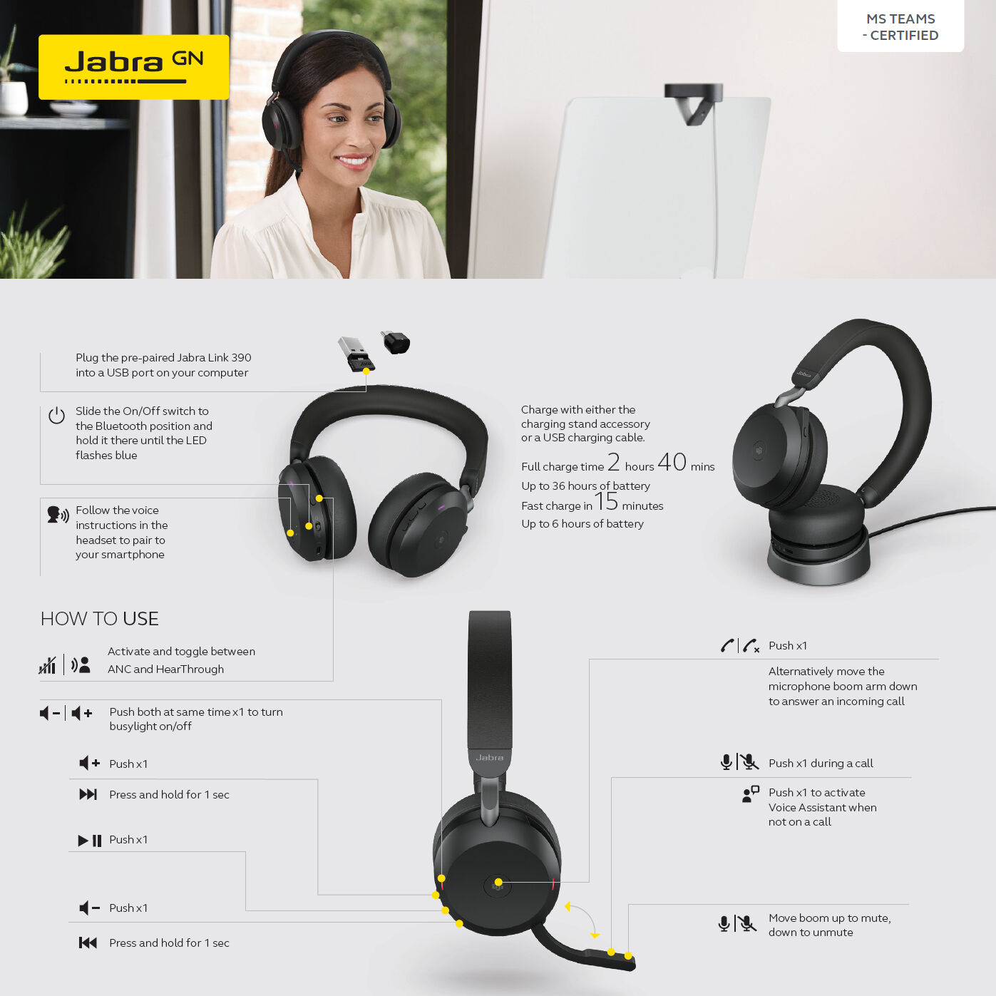 About JABRA Evolve2 75 Stereo + Charging Stand - Wireless Headset - Teams Microsoft Certified - Active Noise Cancelling - Hidden Boom - USB A (27599-999-989)