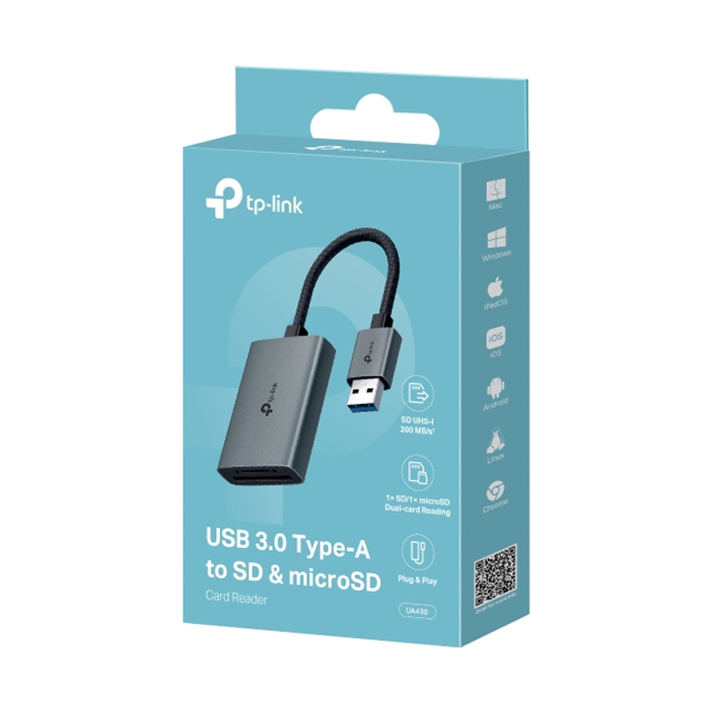 The TP-Link USB 3.0 Type-A Card Reader offers a fast, compact way to transfer photos, videos, and files from SD and microSD cards. With support for UHS-I speeds and USB 3.0 connectivity, it’s ideal for content creators, photographers, and anyone needing quick, reliable access to their memory cards—at home or on the go.